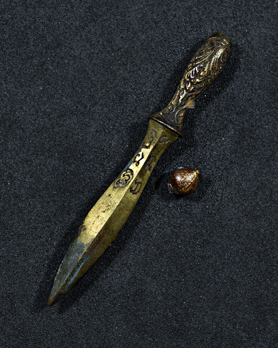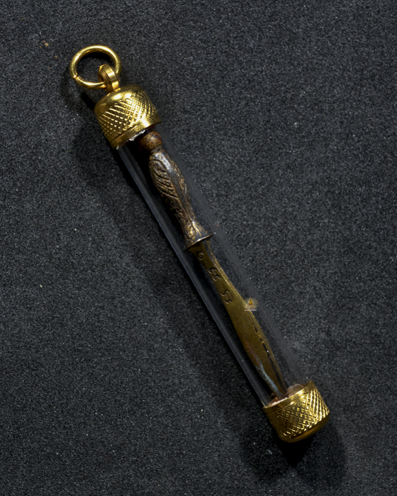 พระขรรค์ รุ่นคูณรุ่งโรจน์ ปี2537 เนื้อนวะโลหะแก่ทอง ด้ามบรรจุตะกรุดเงิน ใส่หลอดตะกรุด ปิดหัวท้ายงานเลเซอร์ ขนาด 6 ซม.