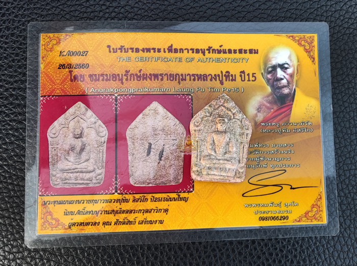 พระขุนแผนผงพรายกุมาร ปี15 บล็อคทองเหลือง พิมพ์ใหญ่ นิยม A เนื้อชมพูว่านสบู่เลือด ตระกรุดสาริกาคู่ พร้อมบัตรรับรองจาก ชมรมอนุรักษ์ผงพรายกุมารหลวงปู่ทิม ปี15