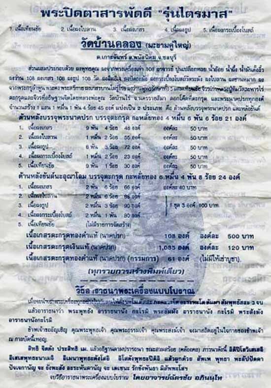 5. 11 ก.พ. 2539 เข้าพิธีพุทธาภิเษกอีกครั้ง ณ วัดบ้านคลอง โดยมีคณาจารย์โดยมีนามอันเป็นมงคล 9 รูป ได้แก่
